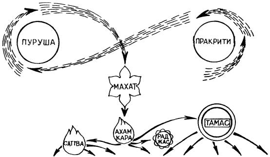Первым проявлением из Пракрити является Космический Разум, называемый Махат, из которого формируется эго (аханкара). Затем эго проявляется в пяти чувствах (танматра) и в пяти органах действия. Таким образом, с помощью саттвы создается органическая вселенная. Затем это же эго проявляется в пяти основных элементах (бхута), и с помощью тамаса создается неорганическая вселенная.