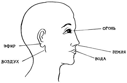 Основные элементы - эфир, воздух, огонь, вода и земля - связаны со слухом, осязанием, зрением, вкусом и обонянием, соответственно.