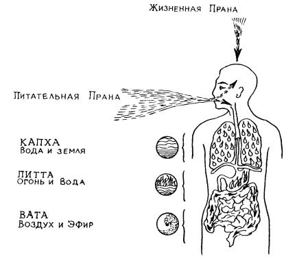 Человек является микрокосмосом. Так же, как пять элементов находятся повсюду в материи, также они существуют в каждом человеке. В человеческом теле много мест, где проявлен элемент эфира. Например, пространство есть во рту, в носу, в кишечно-желудочном тракте, дыхательных путях, животе, грудной клетке, капиллярах, лимфе, тканях и клетках.
